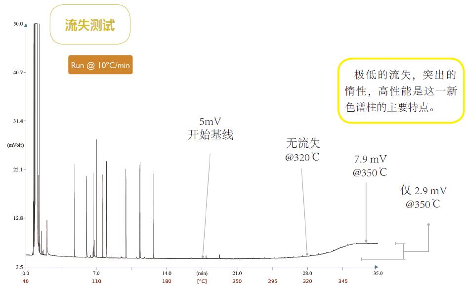 新的 FBX-5MS Xil 自 0.25mm, 0.25μm, 30m 顯示突出低流失水平。即使溫度速率為 10℃ /min( 從 40℃到350℃