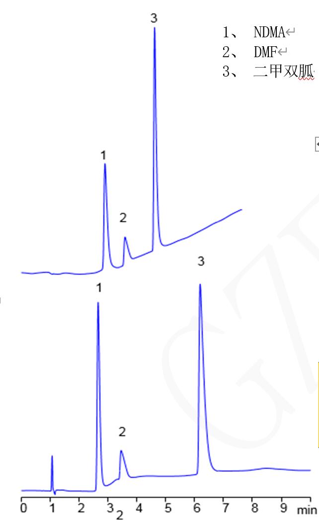 此方法流動(dòng)相適合 MS 檢測(cè)器。很好解決了NDMA 與 DMF 的分離,避免DMF 對(duì) NDMA 實(shí)際檢出量的干擾。樣品中的DMF 3mg/ml 濃度是為了在UV 檢測(cè)器下可以看 DMF。3u 150*3.0mm 或 3u 150*4.6mm是推薦使用的 MS 檢測(cè)器的規(guī)格,可以有更大的實(shí)際二甲雙胍進(jìn)樣濃度,且把二甲雙胍的峰拉得更開。