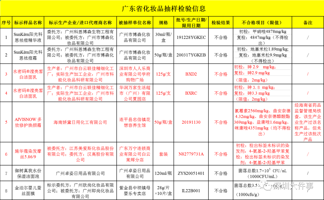 深圳市人人樂(lè)商業(yè)有限公司學(xué)府購(gòu)物廣場(chǎng)銷(xiāo)售的、廣州市科能化妝品科研有限公司生產(chǎn)的水密碼瀅亮皙白潔面乳,初檢、復(fù)檢的砷含量檢出值均為2.9 mg/kg;