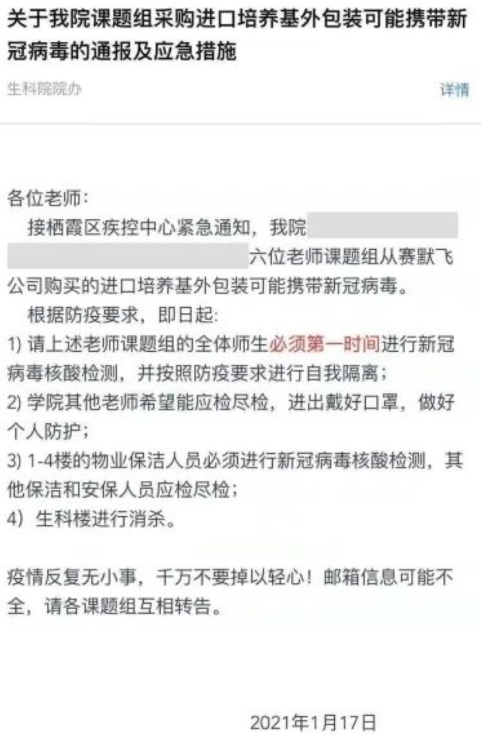 南京某高校群發(fā)郵件通知,該校生科院部分課題組采購的進(jìn)口培養(yǎng)基外包裝可能攜帶新冠病毒,并要求這些課題組全部成員接受核酸檢測(cè)、自我隔離。