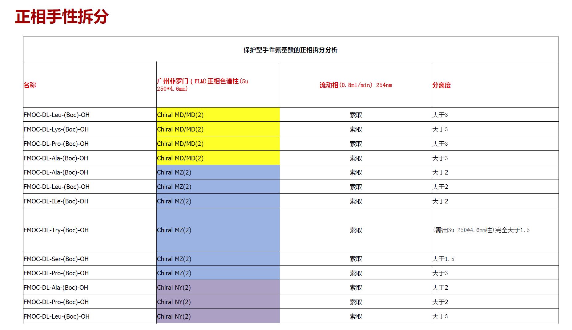 以上手性柱拆分保護型氨基酸的起始流動相建議: