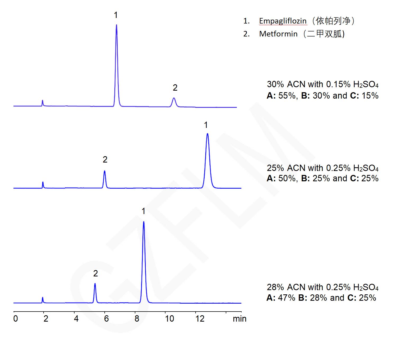 說明:酸強度改變依于陽離子交換的二甲雙胍的保留強度。ACN比例決定依于疏水的依帕列凈的保留強度。兩者調(diào)整可以改變兩個峰的出峰順序。