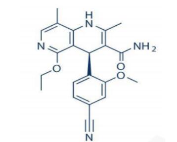 非奈利酮手性異構體分析方法研究 非奈利酮(Finerenone),是由德國拜耳制藥公司開發的第三代高選擇性非甾體類鹽皮質激素受體拮抗藥,化學名為(4S)-4-(4-氰基-2- 甲氧基苯基) -5- 乙氧基-2,8- 二甲基-1,4-二氫-1,6- 萘啶-3- 甲酰胺,化學式為C21H22N4O3,分子量為378.424,結構式如下圖。