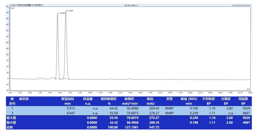 App ID: FLM-B240008 Chiral MZ(2)-RH 手性柱對阿瑞匹坦對映異構體檢測 方法:自定 色譜柱:Chiral MZ(2)-RH 5u 250*4.6mm (貨號:FMG-AC5-B02-R) 流速:0.8 mL/min 檢測:UV210nm, 25oC 樣品濃度:1 mg/mL 進樣量:3 μL 溶劑:異丙醇 色譜圖: