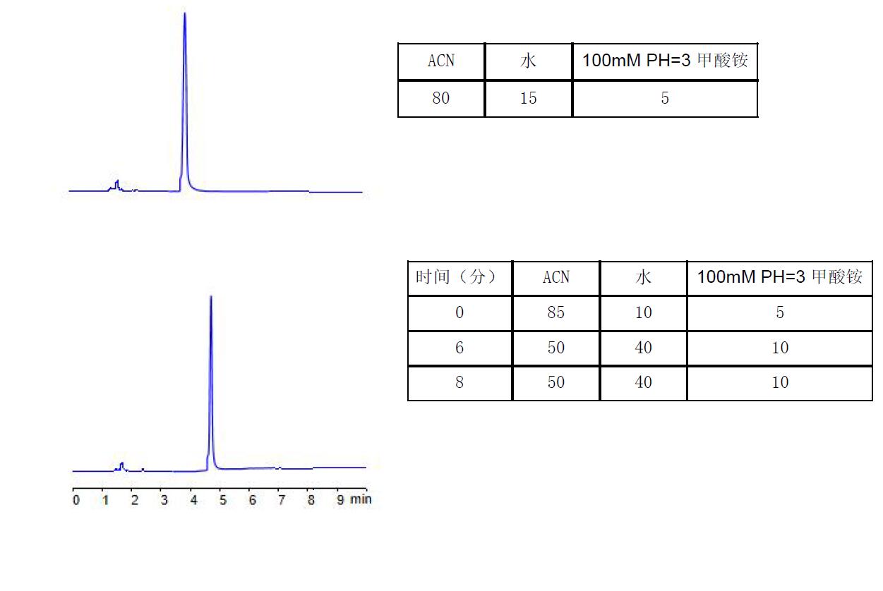 說明:以上應用可以簡單在酸性體系下分析尼古丁。如果是用于MS 檢測器??蛇x擇Comxsil HAC 3u 50*2.1mm(P/N:FMB-HAC3-BONU)柱,0.2ml/min, ACN:5mM PH=3 甲酸銨=85:15,預計2min 出峰分析完畢。 該方法可避免C18 柱酸性條件下的弱保留,拖尾;避免Hilic 柱酸性條件下的重現性問題,避免不喜歡用堿性條件的客戶群體。如果愿意用堿性體系的,菲羅門公司的Titank C18 柱,ACN 與碳酸氫銨的體系,也可以很好分析尼古丁,可向銷售代表索取應用。 |