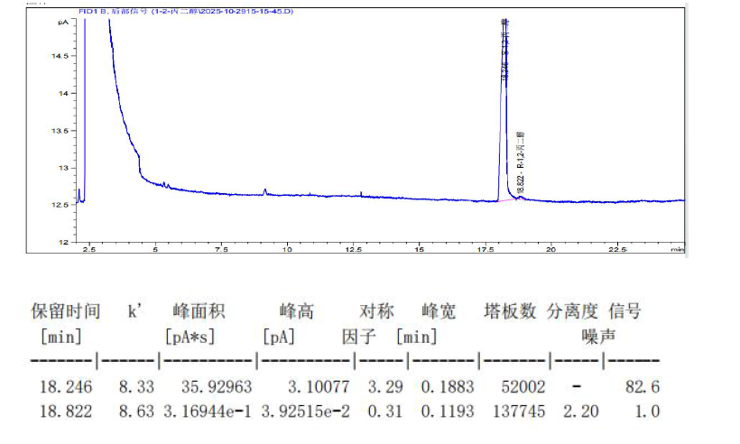 App ID: FLM-F250002 FBX-DEX DET Gamma 氣相手性柱對(R,S)-1,2-丙二醇的手性分離 色譜柱:FBX-DEX DET Gamma 30m×0.25mm×0.25μm 貨號:GDET-025-025-30 色譜條件:咨詢 樣品:(S)-1,2-丙二醇和(R)-1,2-丙二醇,甲醇稀釋為濃度0.1%樣品 進(jìn)樣量:0.04μL 色譜圖(1):S 構(gòu)型先出峰,R 構(gòu)型后出峰,分離度2.88。R 與S 1:1 配比