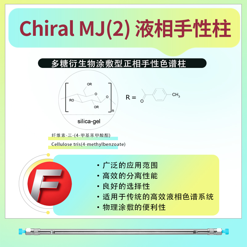 Chiral MJ(2)-RH反相手性柱的固定相為纖維素-三-(4-甲基苯甲酸酯)(Cellulose tris(4-methylbenzoate))。這種固定相具有獨特的手性識別能力,適用于多種手性化合物的分離和分析。