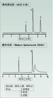 新型高純度硅膠通常比較老的、更具酸性的硅膠更能為堿性化合物提供良好的峰形(參見圖2)。