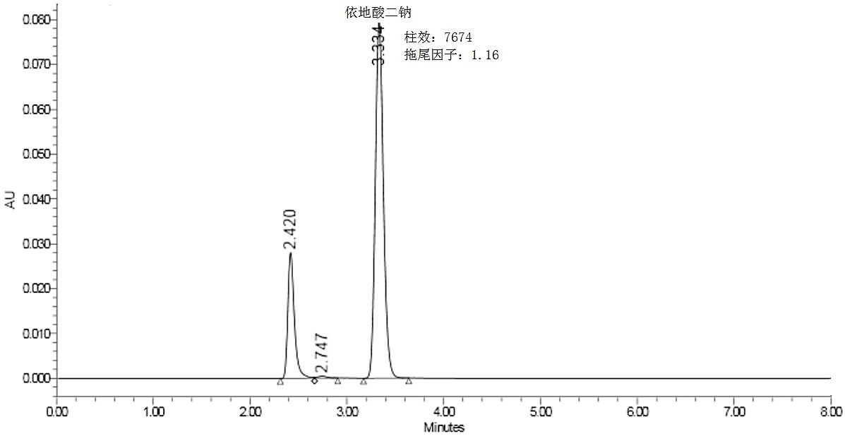 注:下圖中 3.334min 峰為依地酸二鈉,其它峰為溶劑峰。該方法峰形良好且符合靈敏度要求。